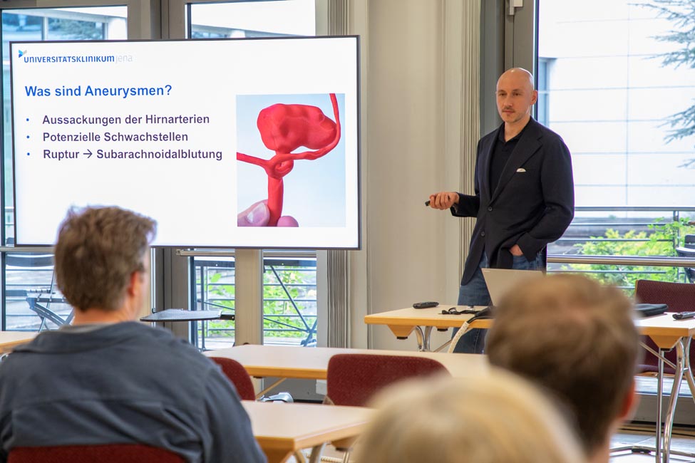 Im wissenschaftlichen Programm eröffnete Prof. Dr. M. Gawlitza (Sektion Neuroradiologie, Universitätsklinikum Jena) mit einem Vortrag zur Behandlung intrakranieller Aneurysmen mittels flow-divertierender Stents. Er stellte Indikationen, technische Vorgehensweisen und Langzeitergebnisse vor und verdeutlichte den Paradigmenwechsel in der Versorgung komplexer Aneurysmen.